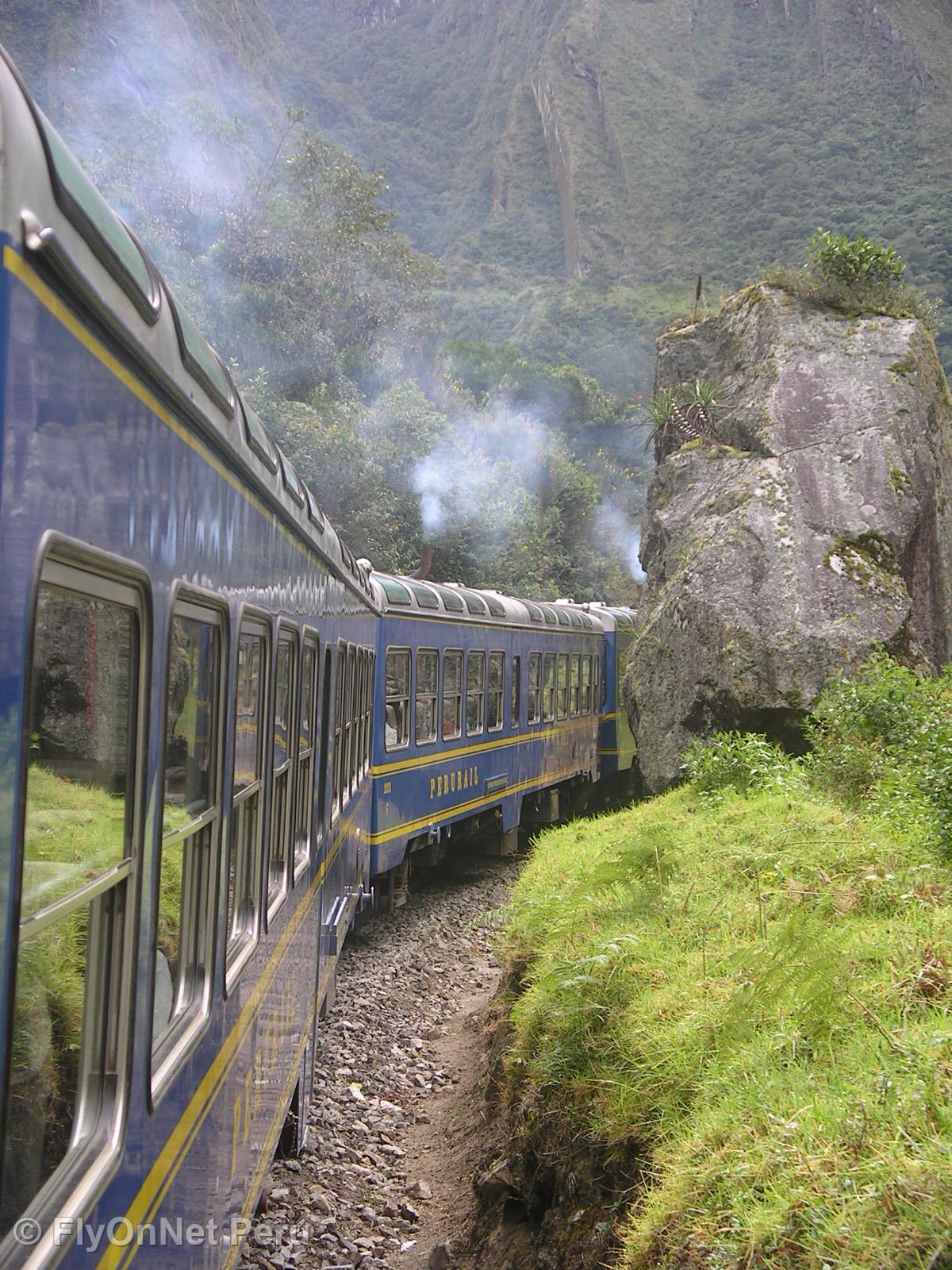 El tren es el medio más popular y cómodo para llegar al Machu Picchu. Dos compañías ofrecen trayectos diarios desde Poroy (a 20 minutos de Cusco) u Ollantaytambo (a 2 horas de Cusco) hasta Aguas Calientes. Cabe destacar que desde hace varios años ya no hay estación de tren en Cusco. Las dos compañías son: